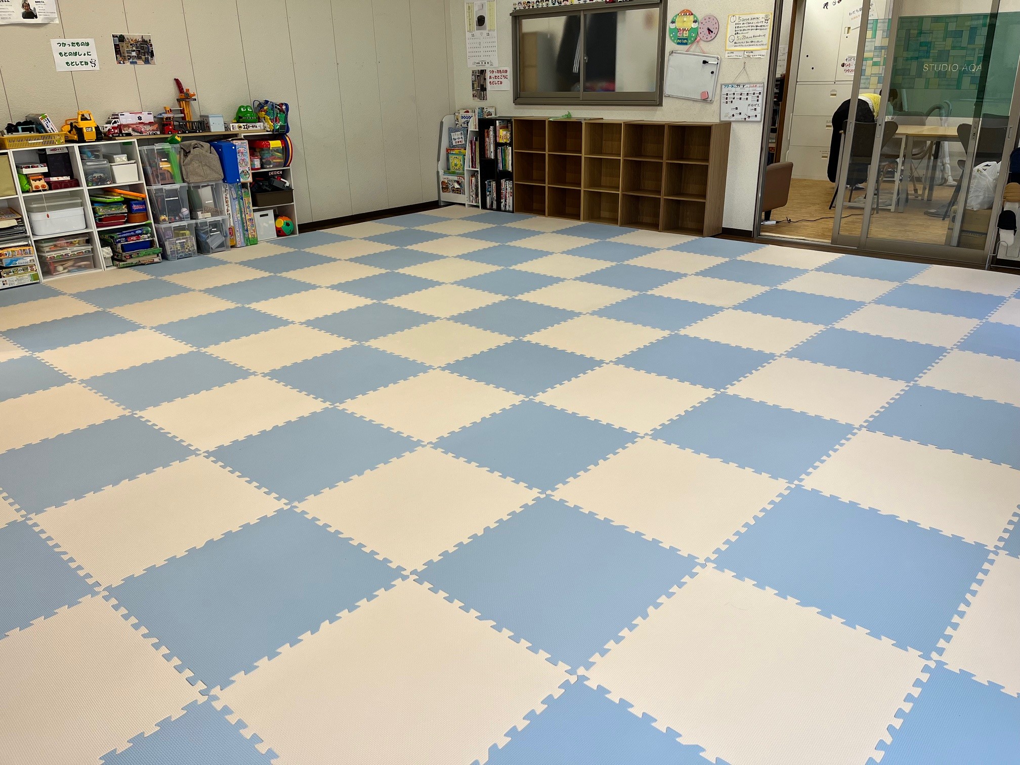 ということで、一番最初に療育室に敷き詰めましたマットも丸5年。2CMあった厚さも0.5mm縮まってしまったので、大掃除を兼ねて全面敷き替えましたヽ(^o^)丿