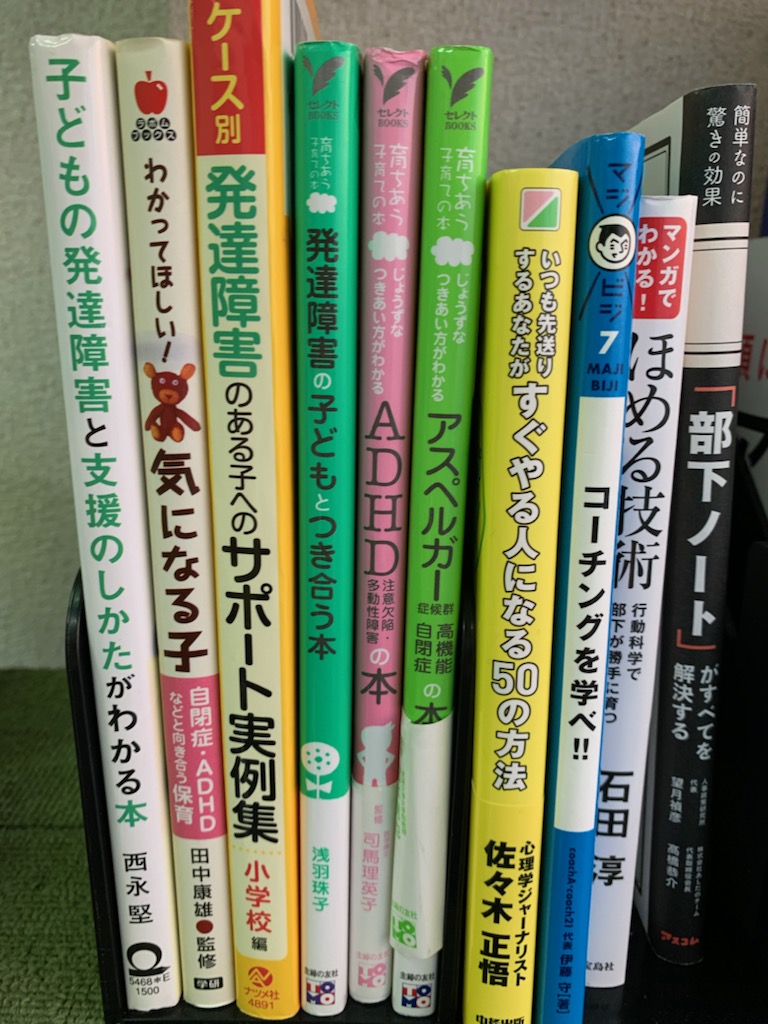 子どもたちの長所が何なのか、短所が何なのかをより深く掘り下げて、より良い支援を子どもたちに提供しています。わだちでは子どもたちの良さを発見し、そこを伸ばしていくため、日々子どものことを観察し、記録をしています。それとは別に、日々職員の方々の自己研鑽のために本を常においています。