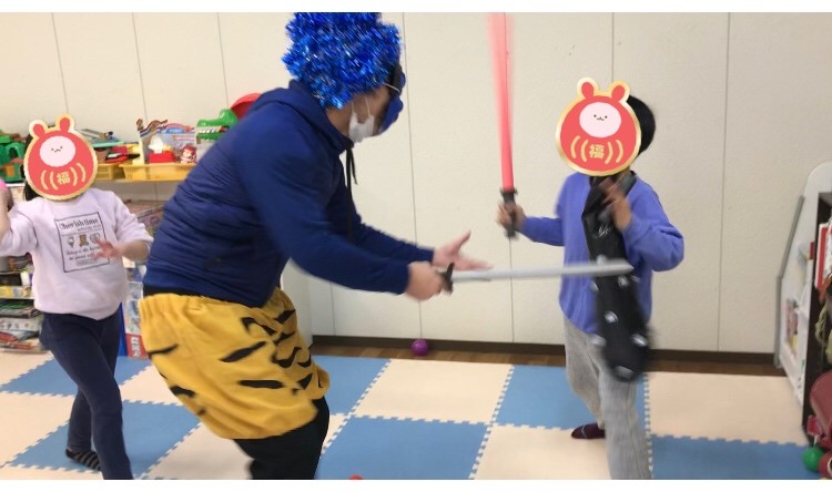 鬼に紛争する職員も毎年少しずつ完成度を上げていっています(*´▽`*)今年は職員手作りの鬼のパンツを導入!そして、きらきらアフロも作成!すごい☆